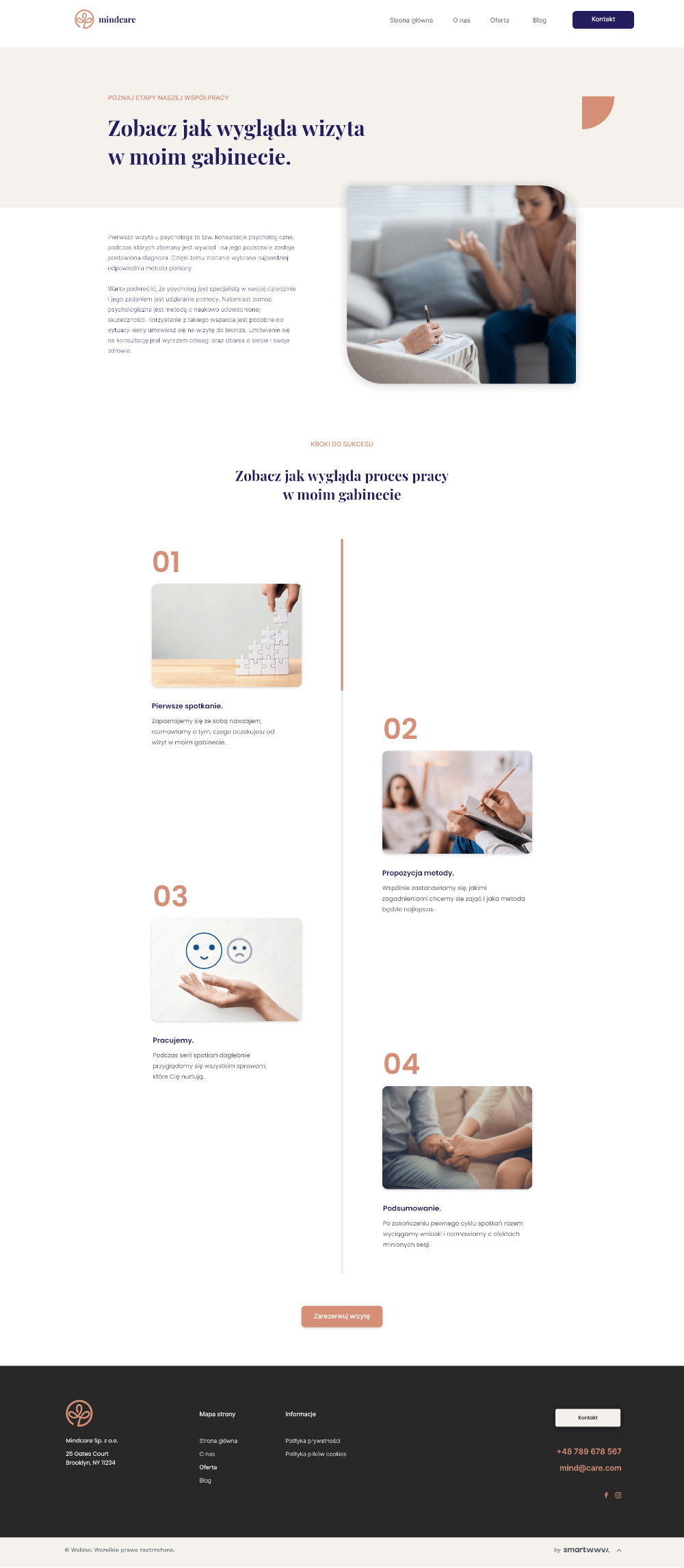 Aby współpraca przebiegła satysfakcjonująco, Twój odbiorca musi wiedzieć, że może Ci zaufać. Dlatego w motywie Personal znajdziesz podstronę, na której w czytelny sposób przedstawisz poszczególne etapy spotkań z Tobą lub procesu, który będziesz przeprowadzał.