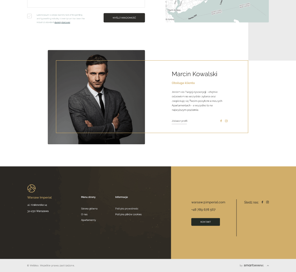 Twoi odbiorcy, inwestując w kupno lub wynajem nieruchomości, muszą mieć świadomość, że Twoja firma jest wiarygodna i rzetelna. Stworzysz taki wizerunek dzięki uzupełnieniu podstrony Kontakt o swoje dane kontaktowe oraz mapę pokazującą Twoją siedzibę. Rozwiej wszelkie wątpliwości potencjalnych klientów, umieszczając na podstronie formularz, przez który będą mogli wyrazić zainteresowanie Twoją ofertą lub zadać dotyczące jej pytanie. Jesteś twarzą swojego biznesu – wykorzystaj to, zamieszczając na podstronie swoje zdjęcie oraz zachęcając do kontaktu z Tobą.
