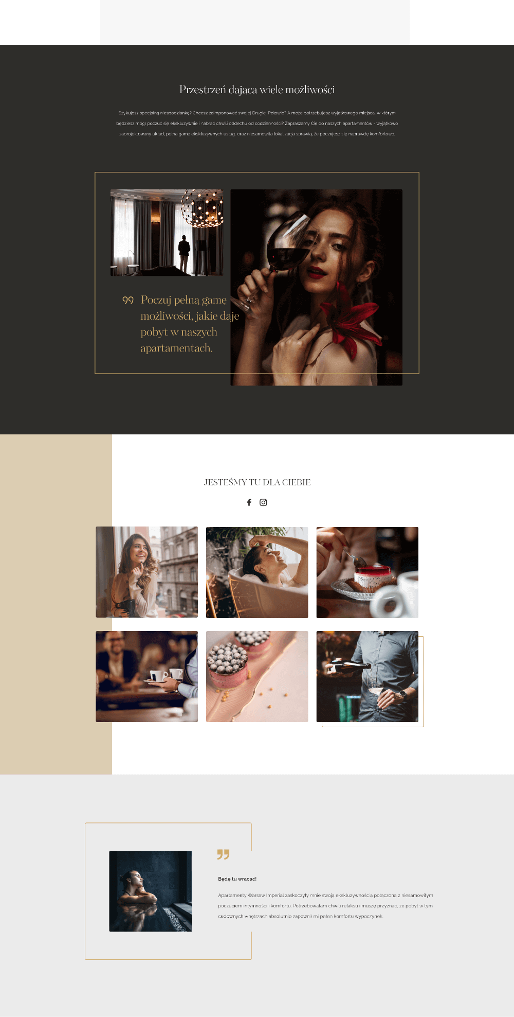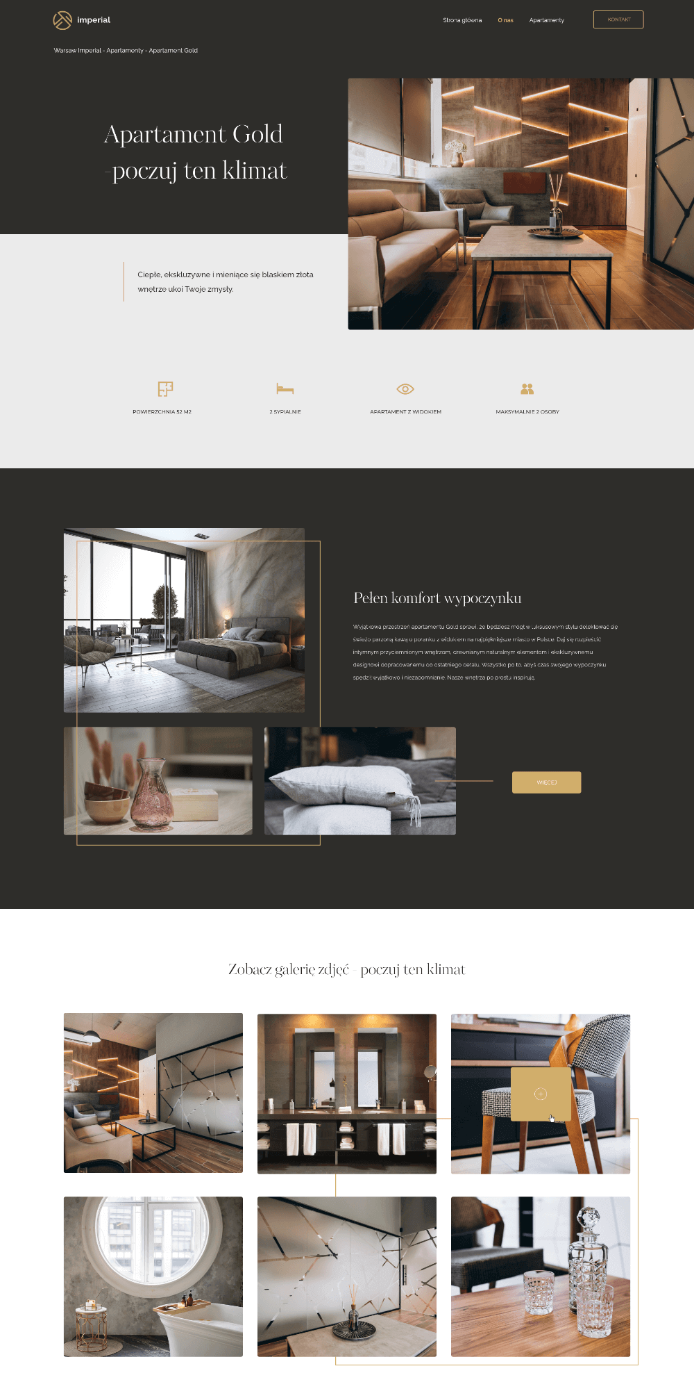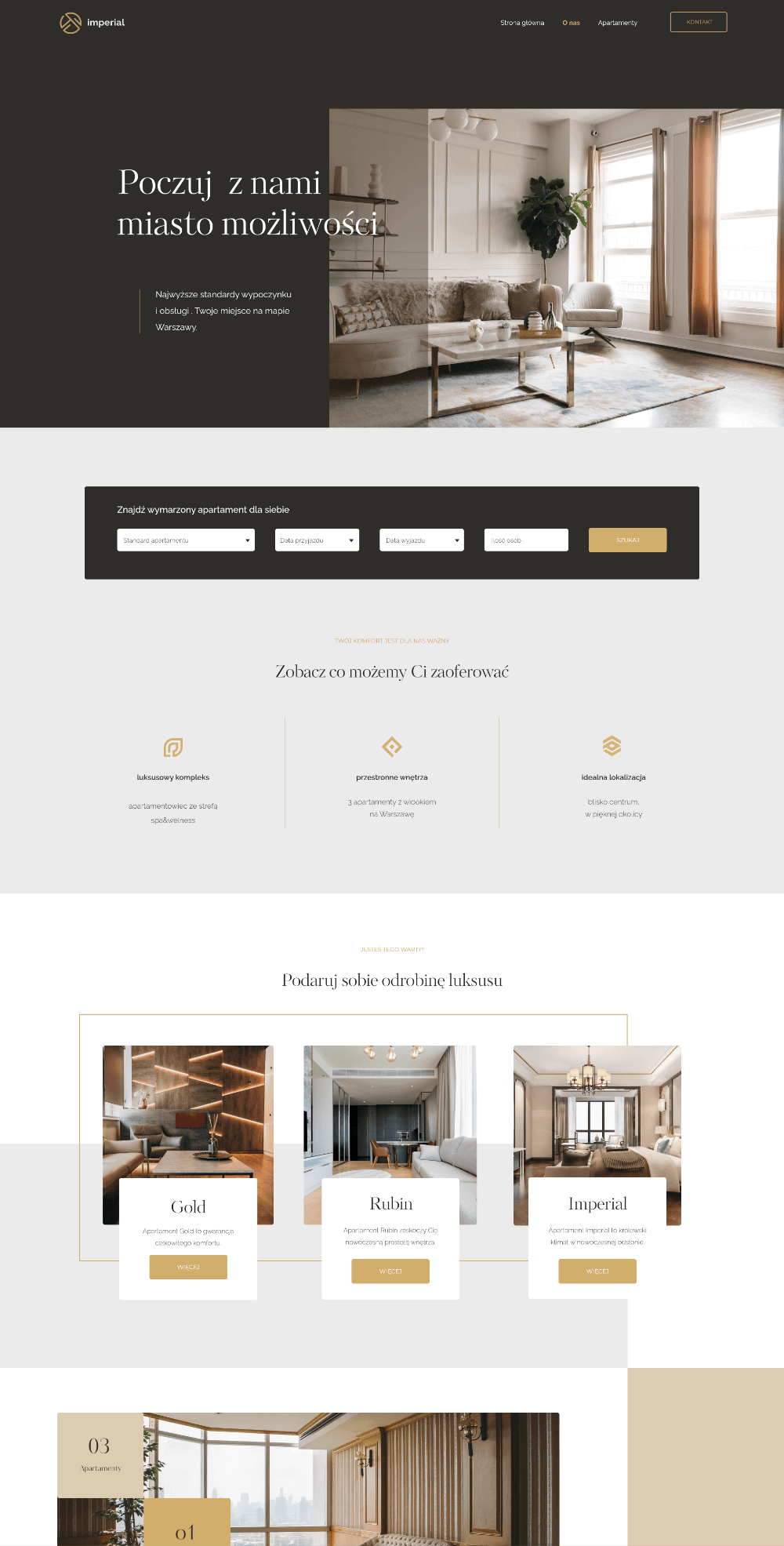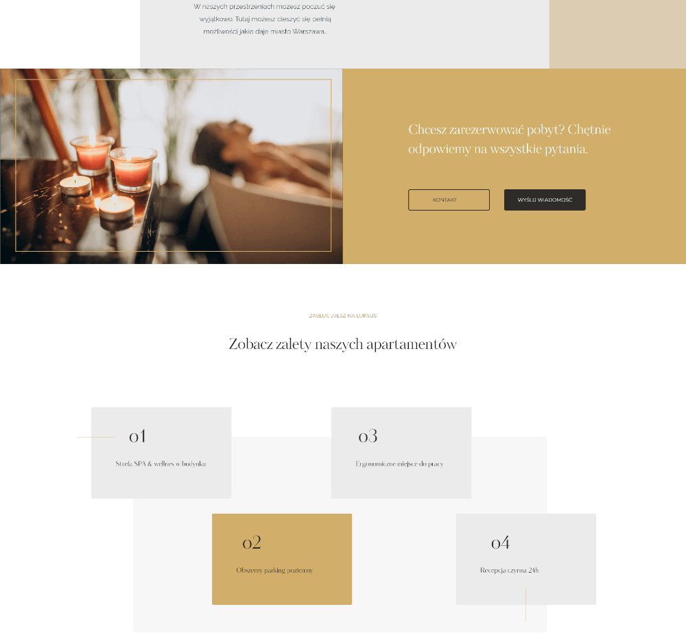Pomoże Ci w tym strona główna motywu Imperial, która będzie stanowić znakomitą wizytówkę Twoich apartamentów. Dzięki krótkiej sekcji opisowej oraz sekcji z zaletami powiesz, dlaczego warto zdecydować się na wybór Twoich wnętrz. Skrótowe przedstawienie oferty pozwoli Ci już na starcie zaprezentować najlepsze obiekty w Twoim katalogu. Sekcja call to action zachęci użytkowników do podjęcia konkretnego działania, a galeria pomoże Ci wyeksponować Twoje wnętrza w pełnej okazałości.