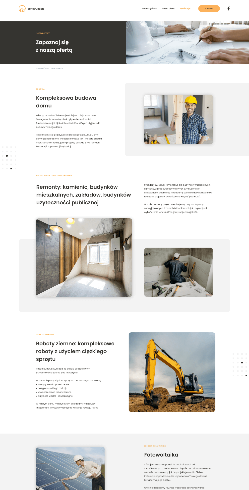 Remonty, wykończenia, instalacje, serwisy - bez względu na to, co dokładnie leży w zakresie Twoich usług, Twoja oferta zasługuje na zaprezentowanie jej w najlepszy możliwy sposób. Zrobisz to na dedukowanej ku temu podstronie na motywie Construction.